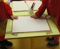 Peinture et liquide vaisselle pour le mélange et peinture directement sur la table  ( un plastique épais peut aussi convenir, ou toute surface plane de ce type) avec un contour délimité au scotch assez épais- ceci afin de laisser du blanc sur la production